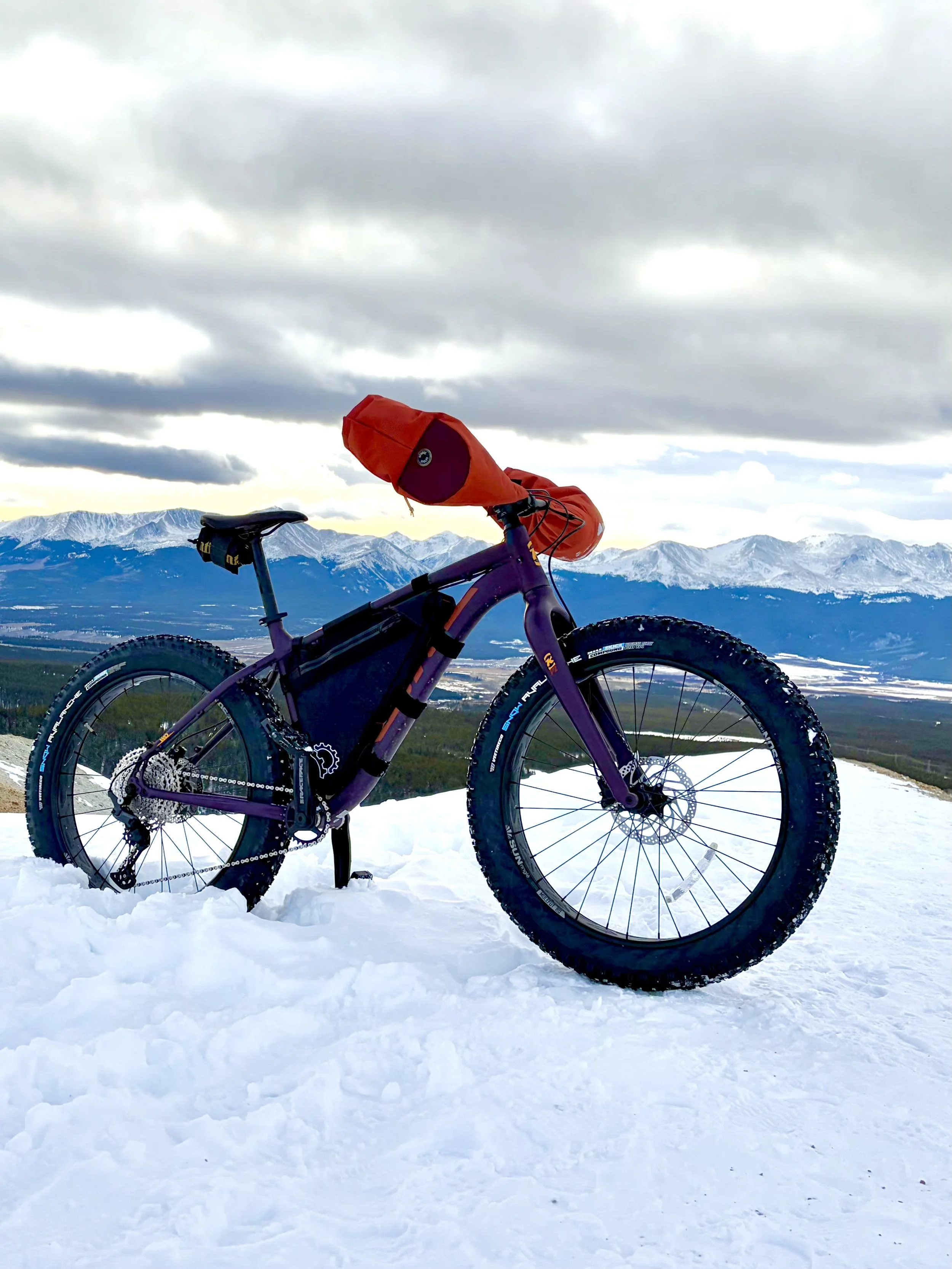 Nice Specialized helmets. Custom pogies from Spruce Cycles handmade in Colorado! (they’re like toasty sleeping bags for your hands!) full frame bags made in USA from Revelate Designs for ease of carrying food,phone,layers,etc and also include free pedal swaps! We have pedals for SPD,Crank Brothers and Time systems available should you prefer to bring your winter cycling shoes. Our summer single child trailer transforms into a fun snow trailer or sled with mini skis to enhance your outing should you want to bring stuff for an overnighter, bike to ski to a hut or just haul your kiddo.